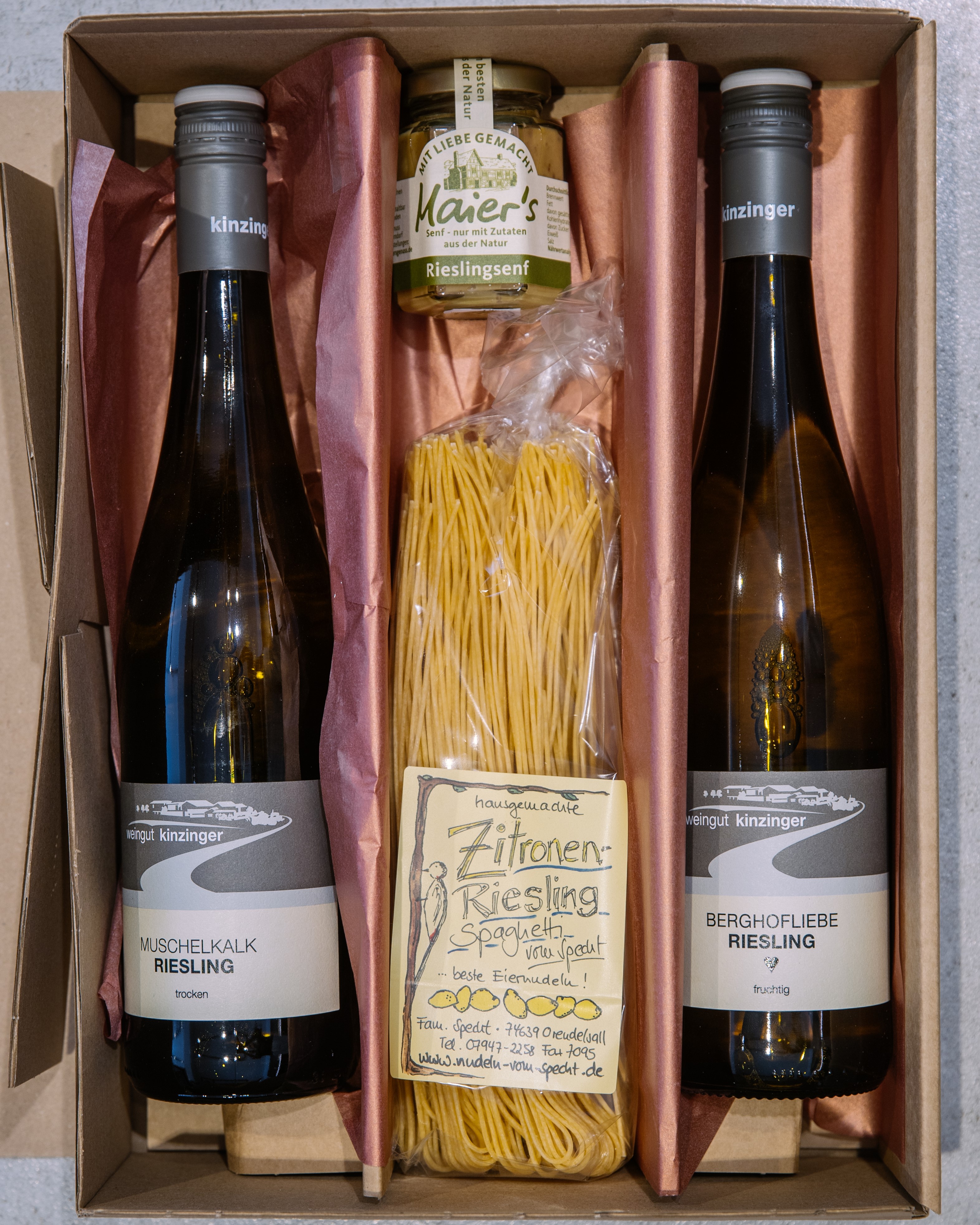 Für Liebhaber des Rieslings und alle, die es werden möchten, bietet dieses Set eine wunderbare Gelegenheit, die Vielseitigkeit und Nuancen dieser Rebsorten zu entdecken. Je eine Flasche Riesling Muschelkalk und Riesling Bergliebe, dazu ein Glas Rieslingsenf und ein Pack Zitronen-Riesling Spaghetti. Weitere Informationen