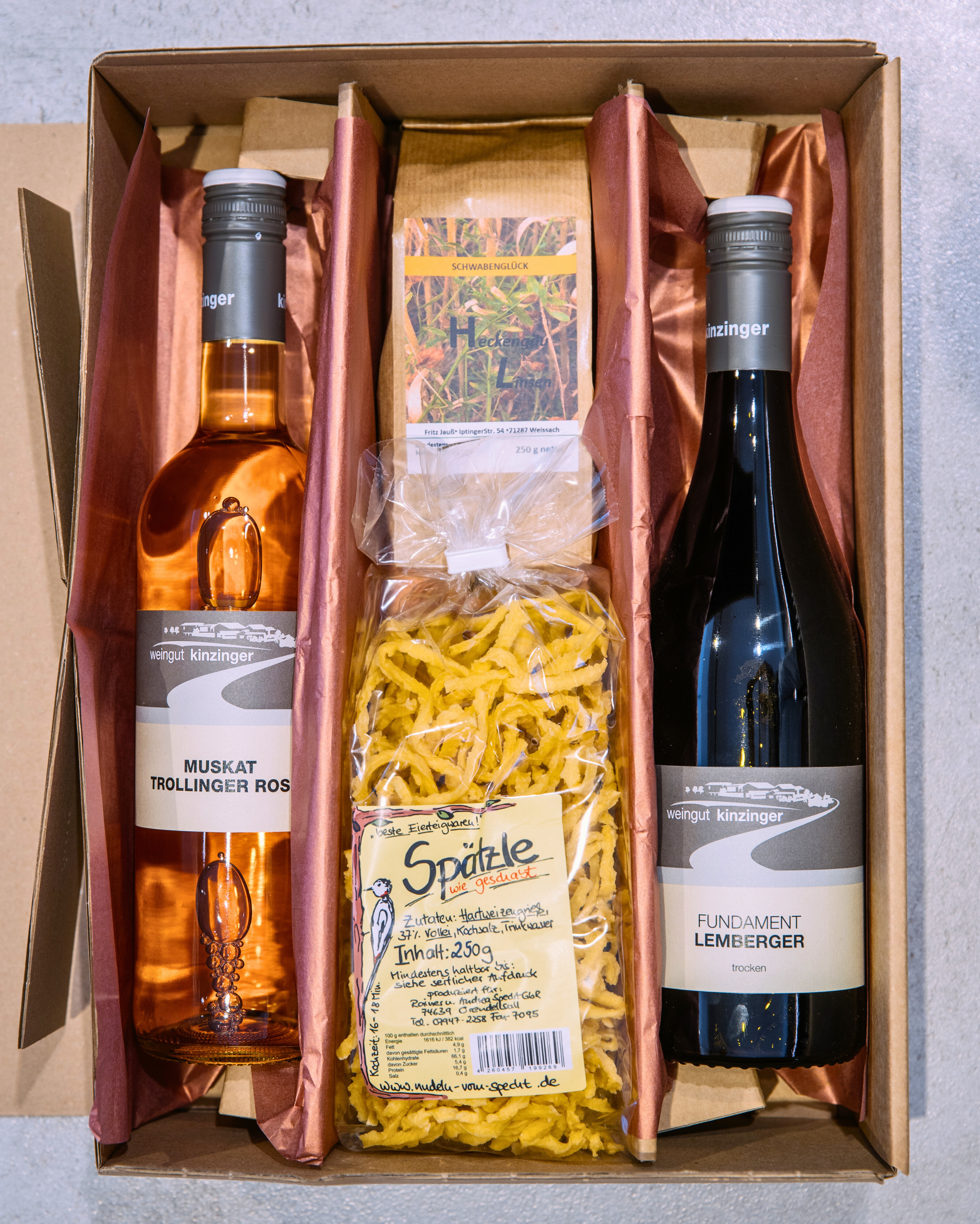 Ein perfektes Geschenk für alle Liebhaber der schwäbischen Küche. Spätzle vom Hohenloher Land, Linsen aus dem Heckengäu, je eine Flasche Gutswein Lemberger Fundament und Muskat-Trollinger Rosé! Dieses Paket stellt nicht nur eine kulinarische Reise durch unser "Ländle" dar, sondern ist auch ein liebevolles Geschenk für alle Feinschmecker!